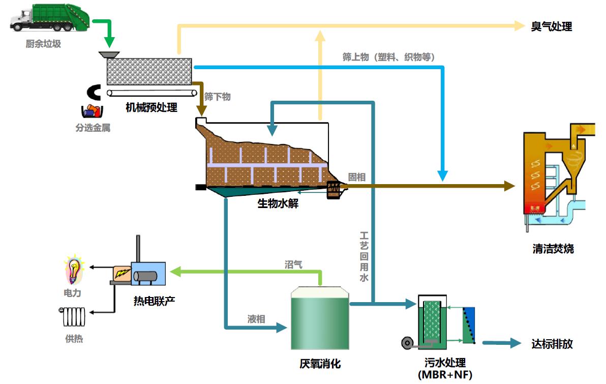 該項(xiàng)目處理工藝為:“機(jī)械預(yù)處理+生物水解+厭氧消化+沼氣發(fā)電+RDF利用”