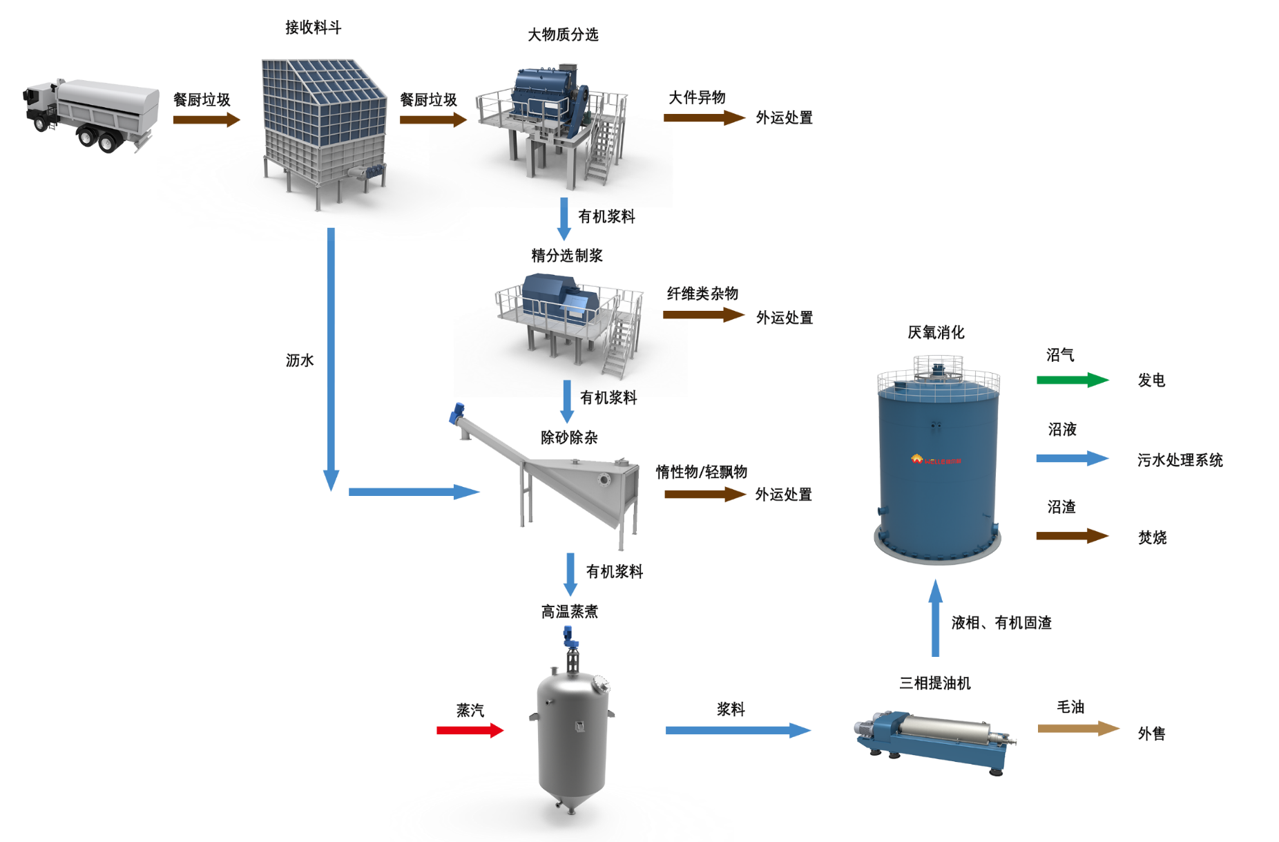 結合一期項目的運營經驗,充分考慮到餐廚垃圾的特點和處理難點,二期項目采用“機械預處理+厭氧發酵+沼氣發電+污水處理+除臭處理”終端處置工藝,該工藝在減少處置過程中固渣、廢水、臭氣等污染物的同時,充分有效地分離餐廚垃圾中的有機質并對其進行資源化利用,實現了餐廚垃圾中油脂的最大化資源回收。